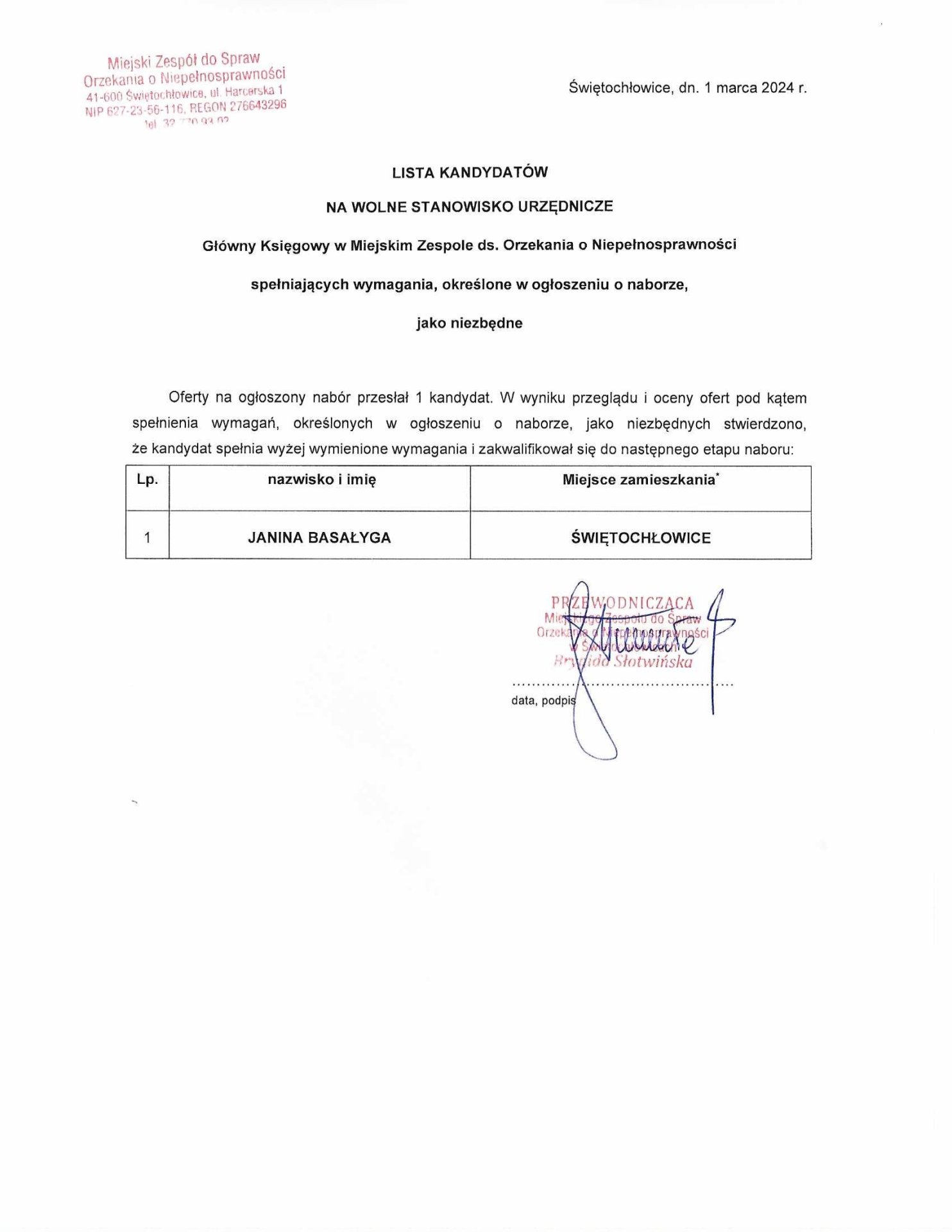 Lista kandydatów na stanowisko Głównego Księgowego w Miejskim Zespole ds. Orzekania o Niepełnosprawności